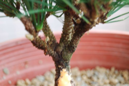 千壽丸為對生出芽,分枝處容易腫大,預計最近處理此腫大部位,餘枝允以接至其他台灣黑松。
