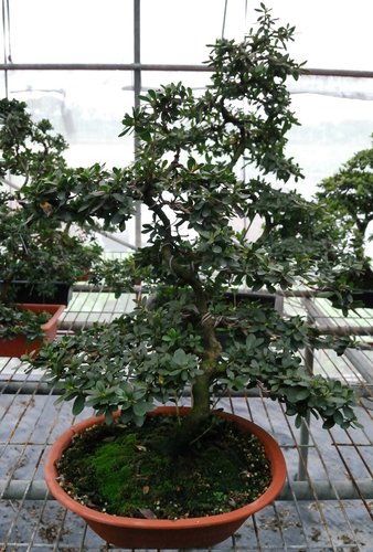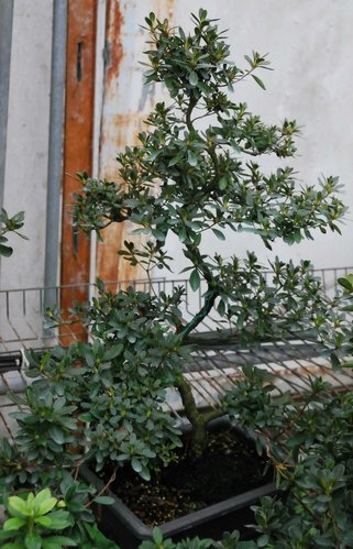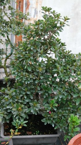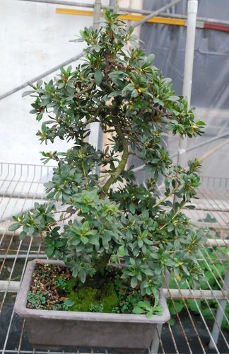 皋月杜鵑的枝幹比較脆,能藉由針金造形的幅度有限,但樹的生長勢較強,可在短時間完成作品;但若使用截幹蓄枝方式,卻無法在短時間完成作品,這二者間的斟酌因人而異。