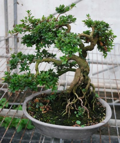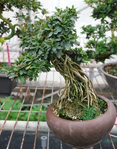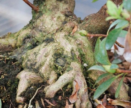 皋月杜鵑只要盆土適合,根盤就會自然形成八方根盤,若使用顆粒土,則無法獲得此效果。此培養土經阿國精心調配與試驗後,目前普用於皋月杜鵑的培植中。而此素材已有萬元行情,目前正在構思造型與培育中。